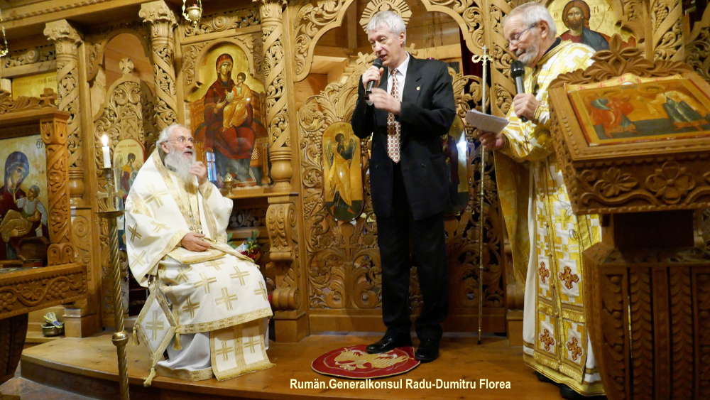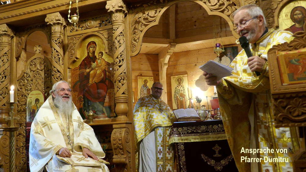 In einer kurzen Ansprache dankte Pfarrer Dumitru Viezuianu allen Anwesenden für Ihre Mitfeier, besonders aber Se. Eminenz Metropolit Serafim für die vielen Göttlichen Liturgien, die dieser im Laufe von 40 Jahren mit der Gemeinde gefeiert habe. Im Rückblick gelte sein Dank jedoch vornehmlich Gott, der ihn in den Jahren seiner nun schon langen Lebenszeit mit Höhen und Prüfungen getragen habe. Dankbar sei er auch für die unzähligen Begegnungen mit Menschen, bei denen er Christus begegnen durfte. Doch habe er als Seelsorger zunehmend erfahren, dass Seelsorge nicht in großen Worten geschehe, sondern in der Treue des Alltags, im Zuhören, im Gebet und im gemeinsamen Tragen des Kreuzes.