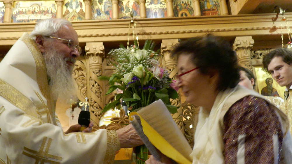 Einem Vater gleich schloss daraufhin Metropolit Serafim sichtlich erfreut und dankbar in einer bewegend herzlichen Geste seinen Erzpriester Dumitru in seine Arme, umarmte ebenso dessen Ehefrau Eugenia, die ihrem Mann in all den Jahren eine große Stütze war, und dankte ihr mit einem Strauß weißer und rosafarbenen Rosen.